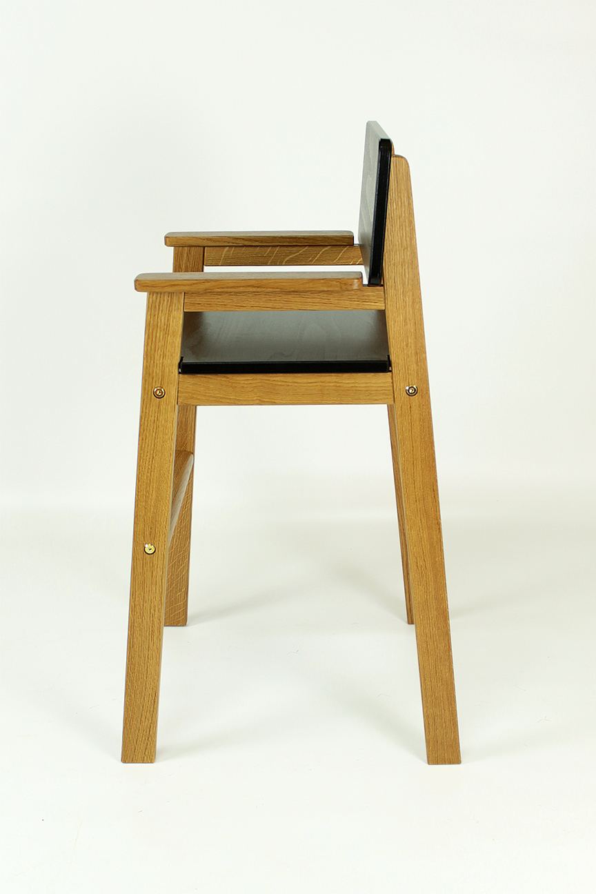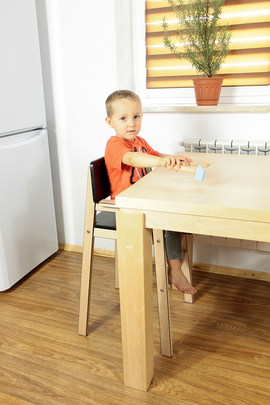 Wysokość podłokietników jest tak dobrana, aby krzesło wsunęło się pod większość standardowych stołów – dzięki czemu dziecko jest odpowiednio do niego przysunięte.