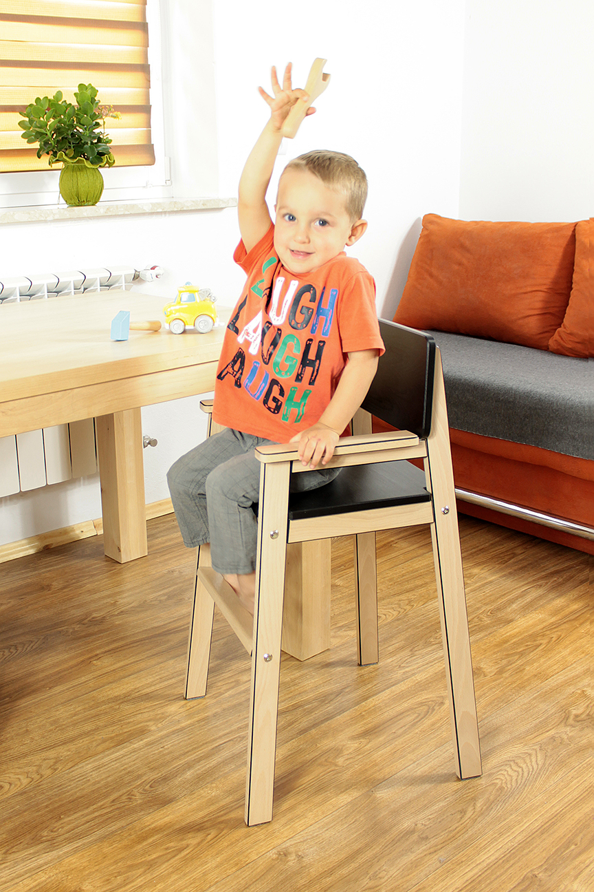 Krzesło Hania, idealnie sprawdzi się, kiedy dziecko wyrosło ze swojego “krzesełka z tacką” i jest zainteresowane jedzeniem przy stole razem ze wszystkimi domownikami.